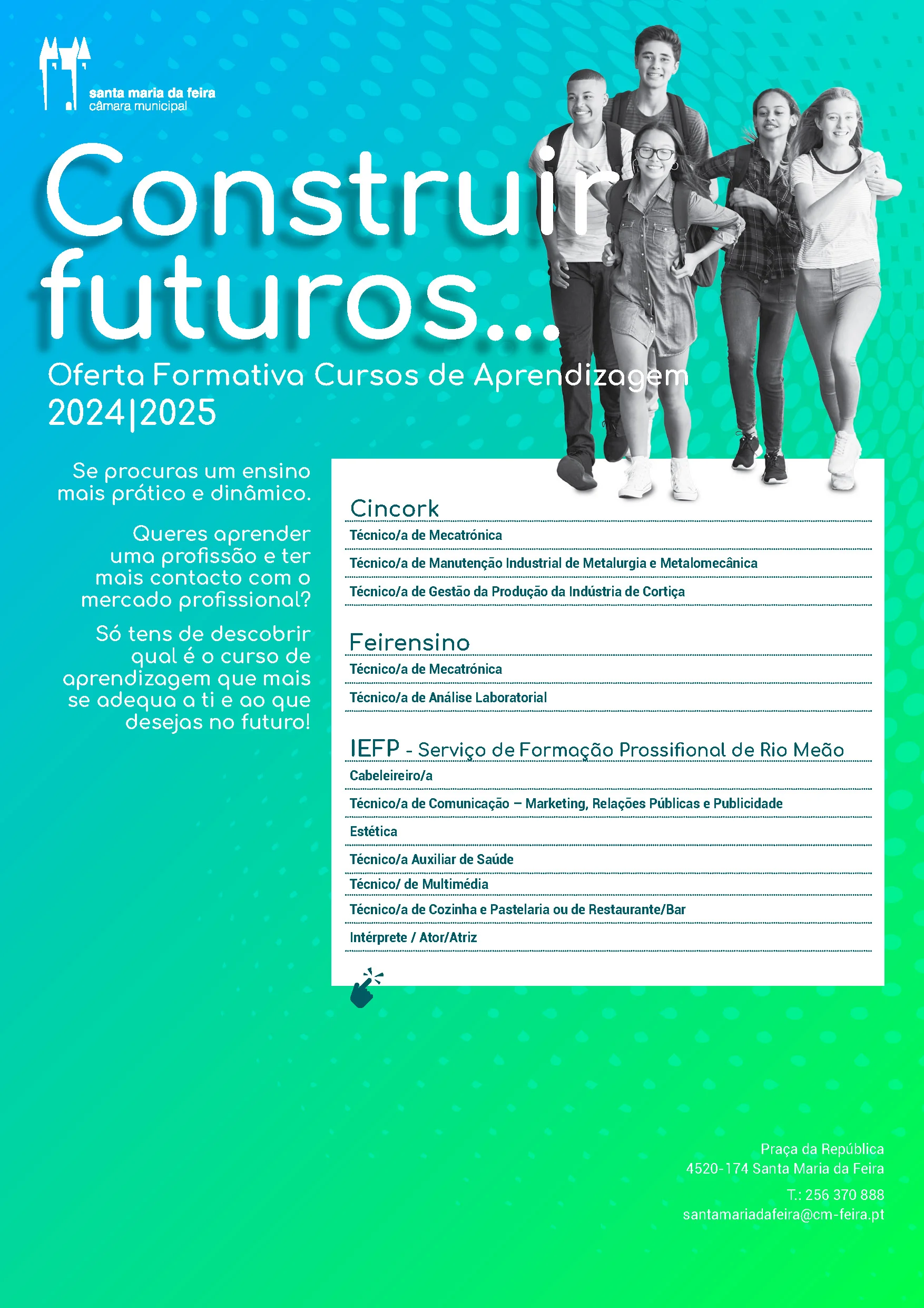 O Município de Santa Maria da Feira já disponibilizou na sua página, na internet, a Oferta Formativa de cursos Profissionais e de Aprendizagem do concelho para o ano letivo de 2024/2025 e na qual o Cincork a sua oferta nos Cursos de Aprendizagem